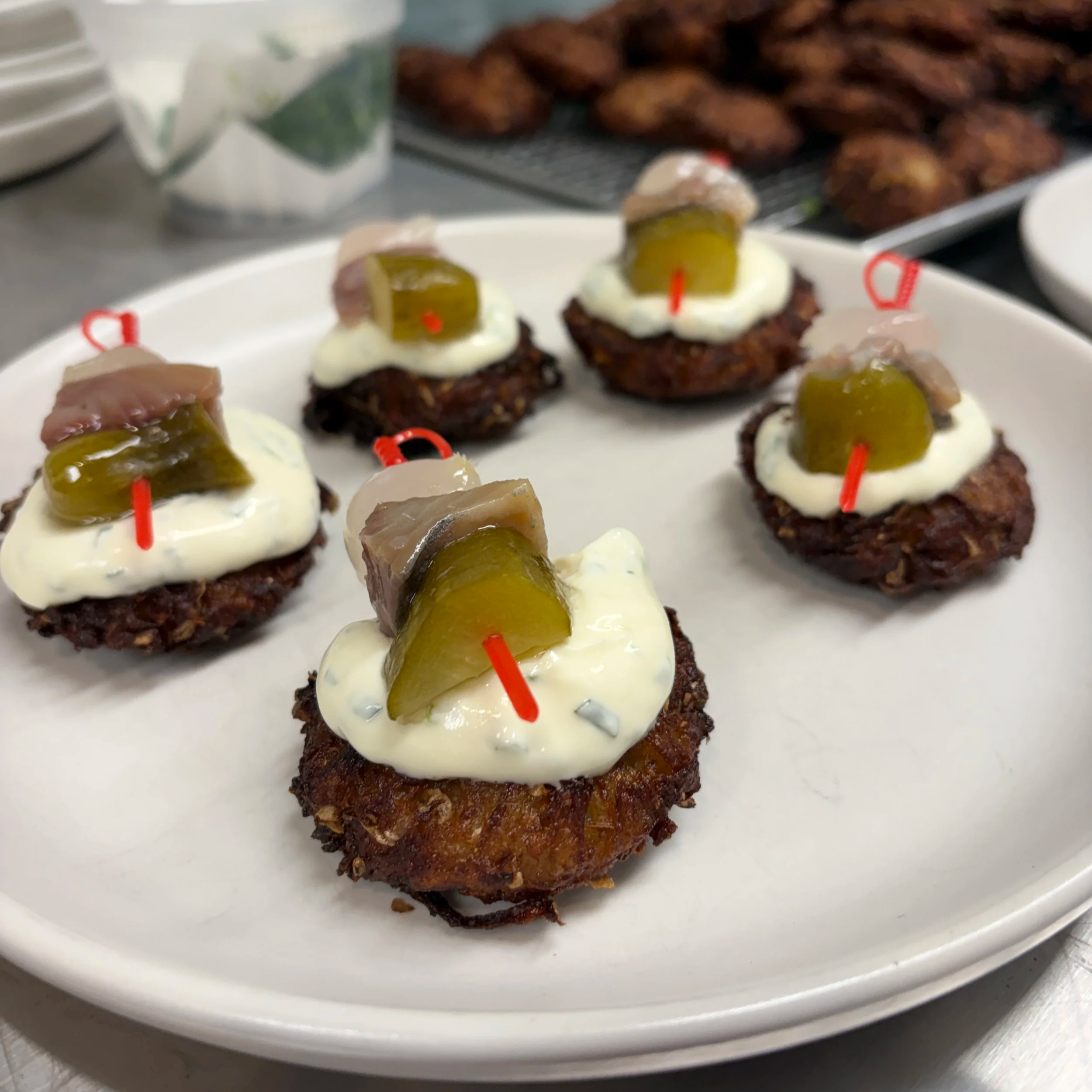 Onions: Pickled pearl onions are commonly sold as cocktail onions. I prefer tipsy onions in Vermouth. The onions are a bit larger and crunchier, but nice and sweet, which plays well with the salty, sour, and creamy flavors of the herring and pickle.